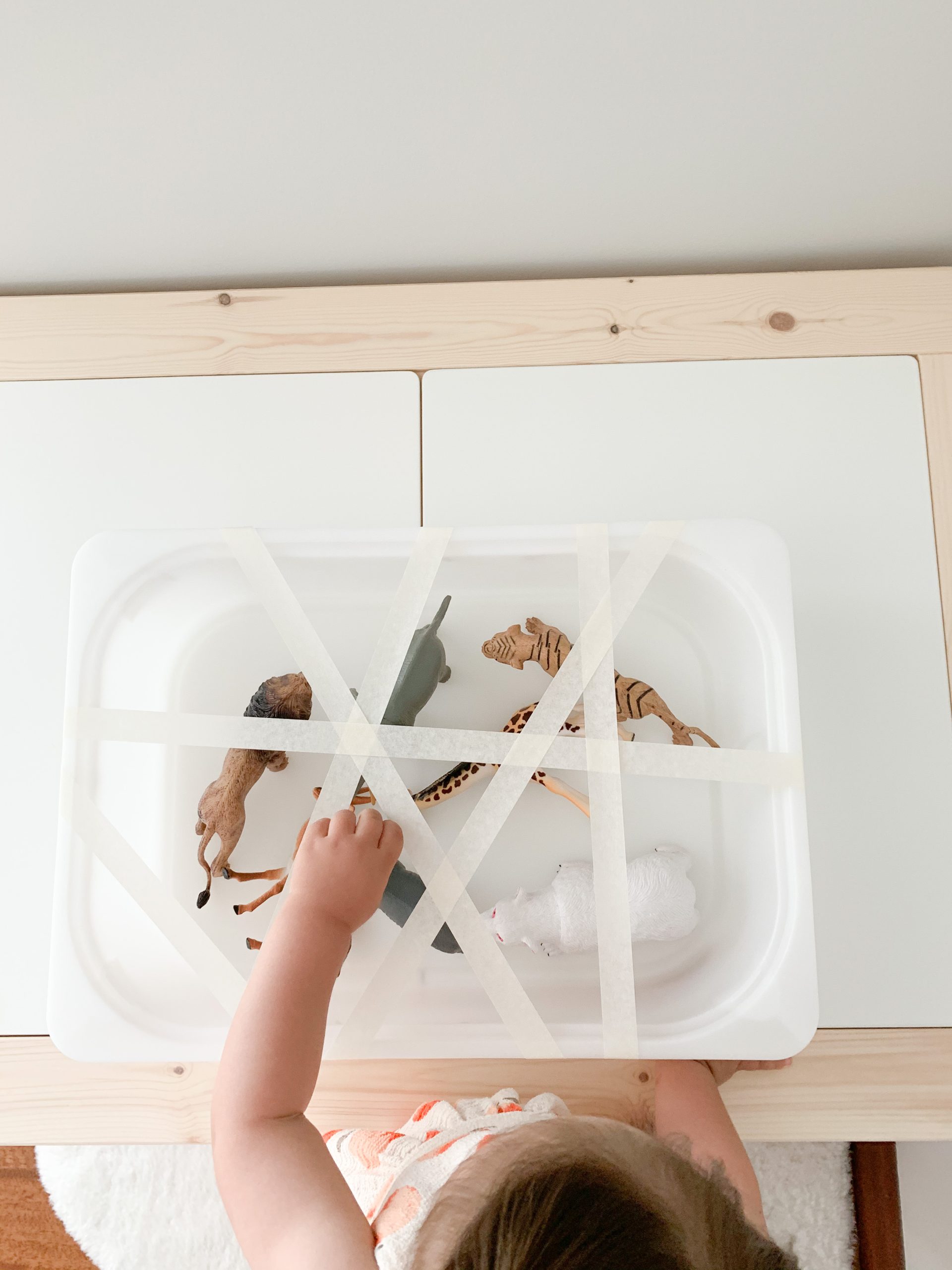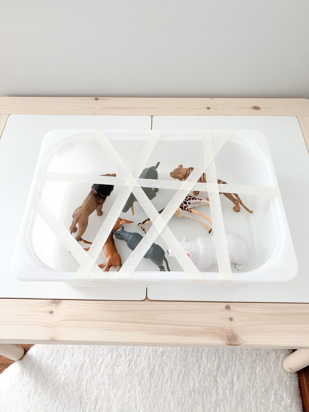 Put the animal figurines inside the bin and add pieces of tape as you see in the picture.