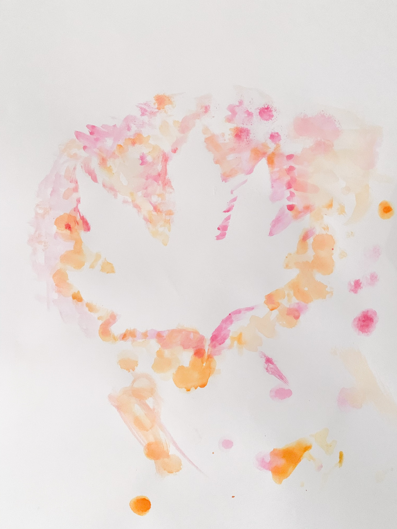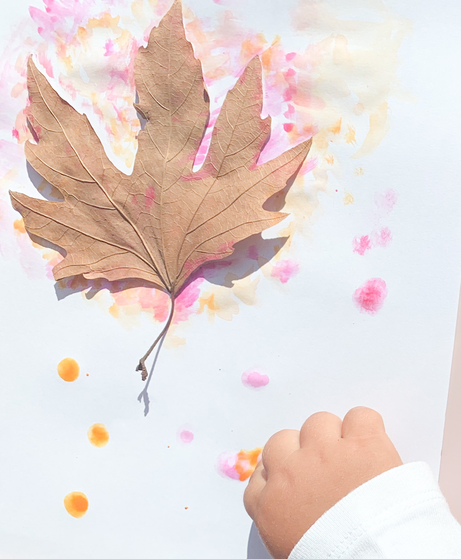 Invite your child to arrange the leaf (or leaves) however they want on the paper. Once you’ve decided on the layout, tape the back of the leaf/leaves to the paper so they don’t move while the child is working. Now invite the child to paint the negative space around the leaf.