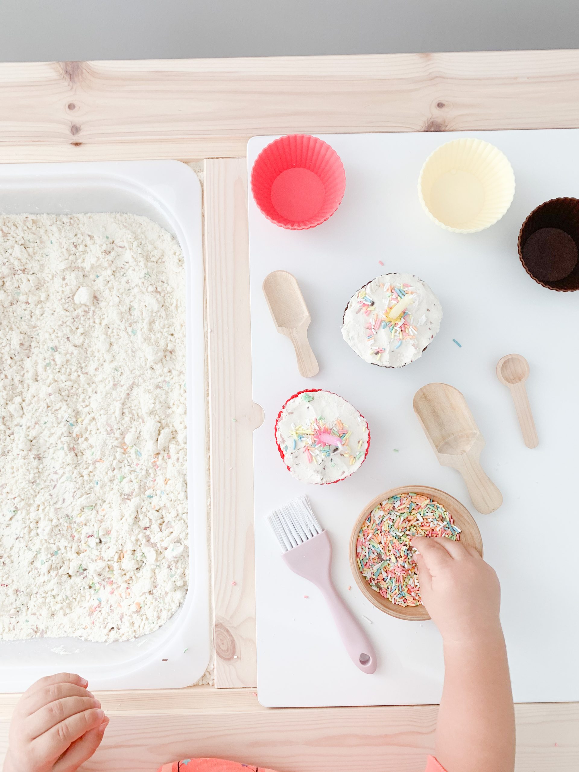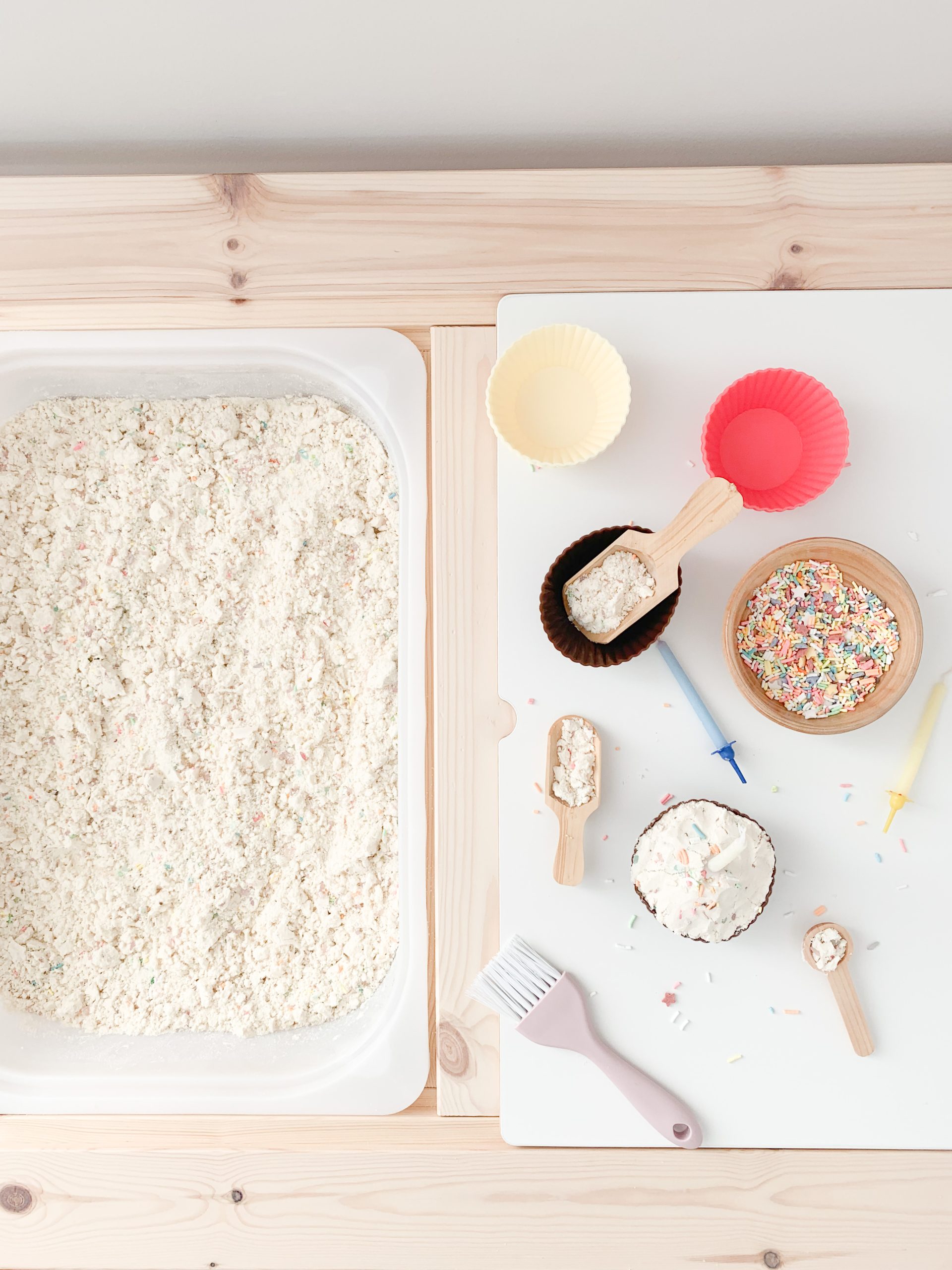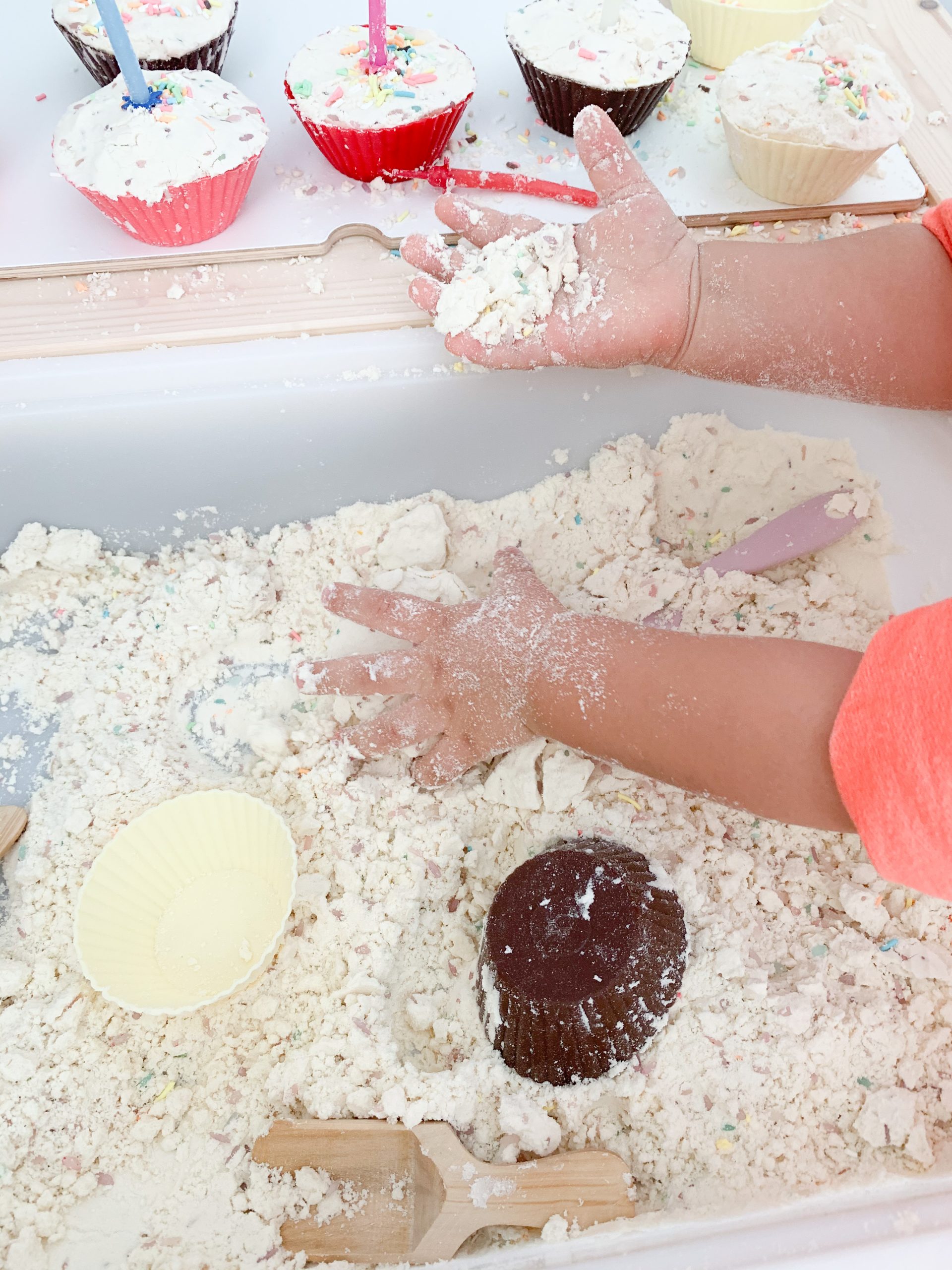 For the week that A was turning 2, I created this sensory bin using cloud dough, cupcake liners, sprinkles and a few birthday candles.