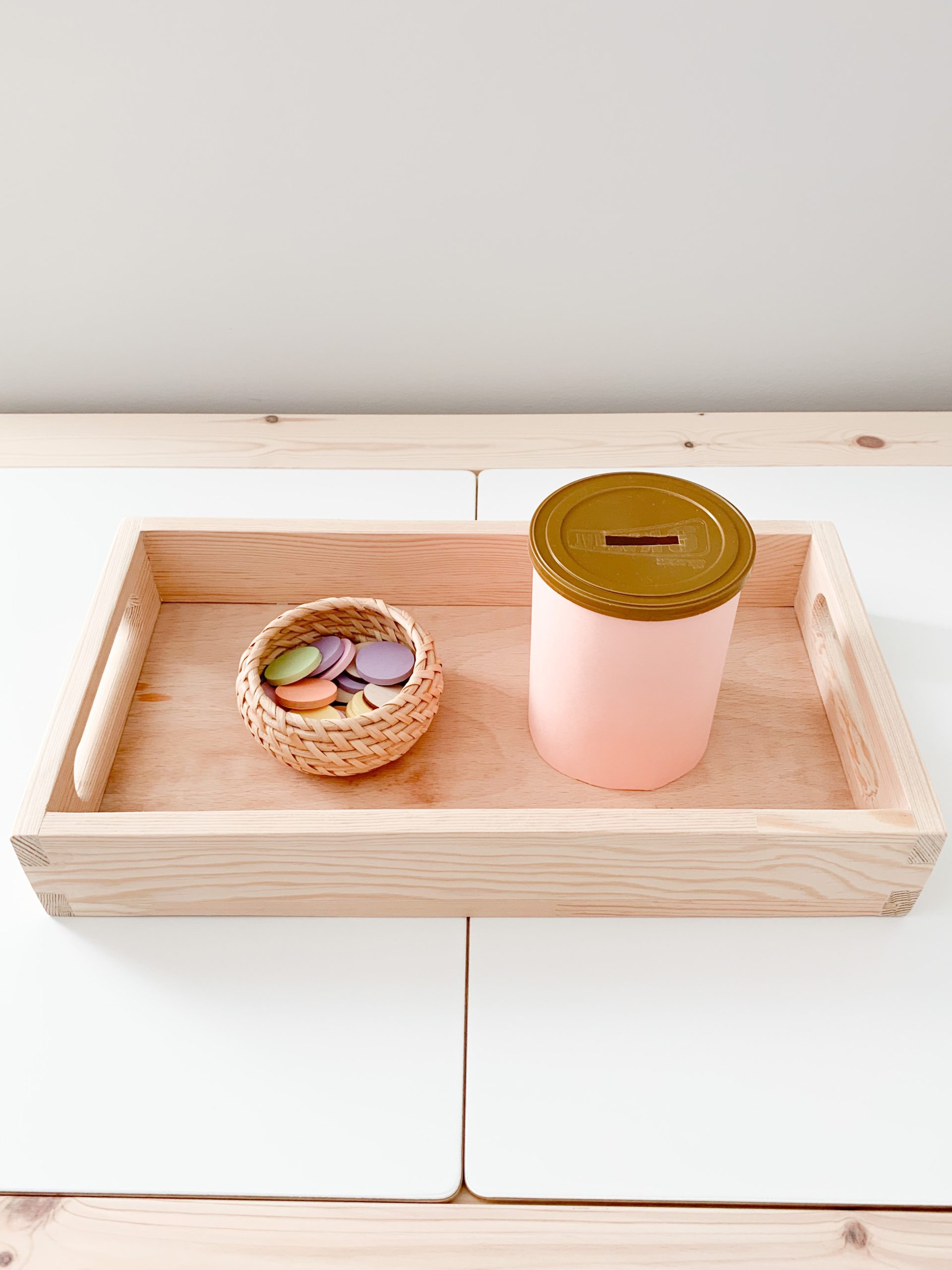 I simply cut a slot on the lid using an X-acto knife and covered the container with coloured construction paper so the label wouldn’t be distracting. You can find the wooden chips here.