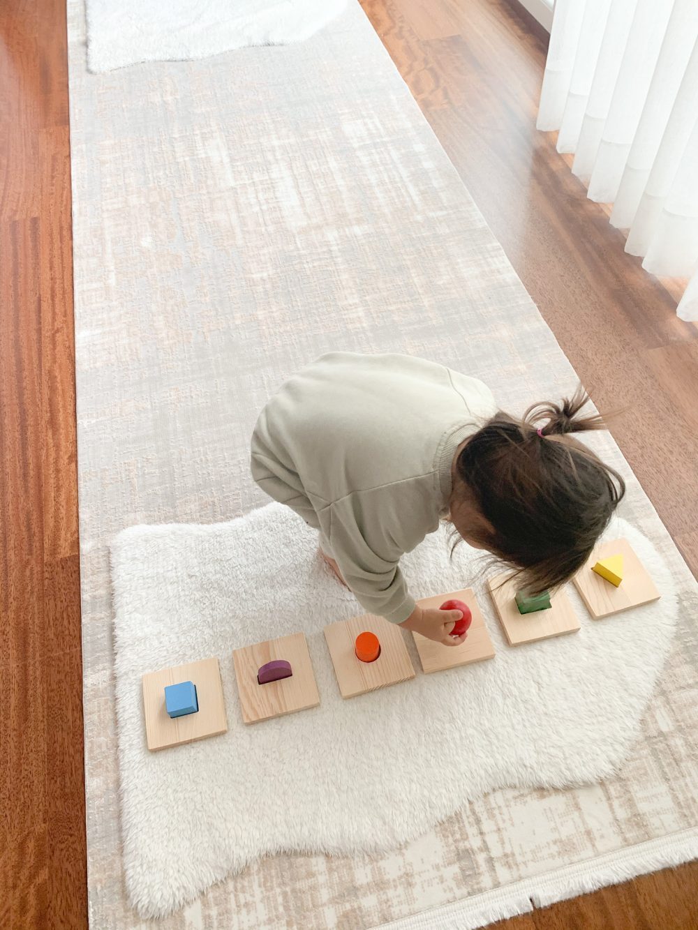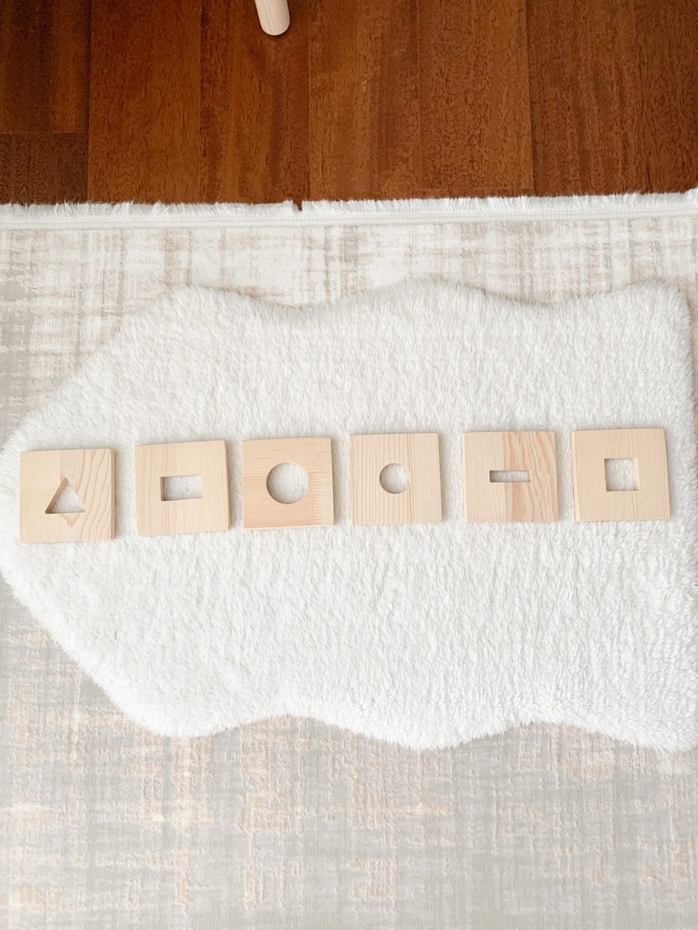 We used the interchangeable lids and shapes from A’s Imbucare box, but you can use any object-to-picture matching materials you have.
