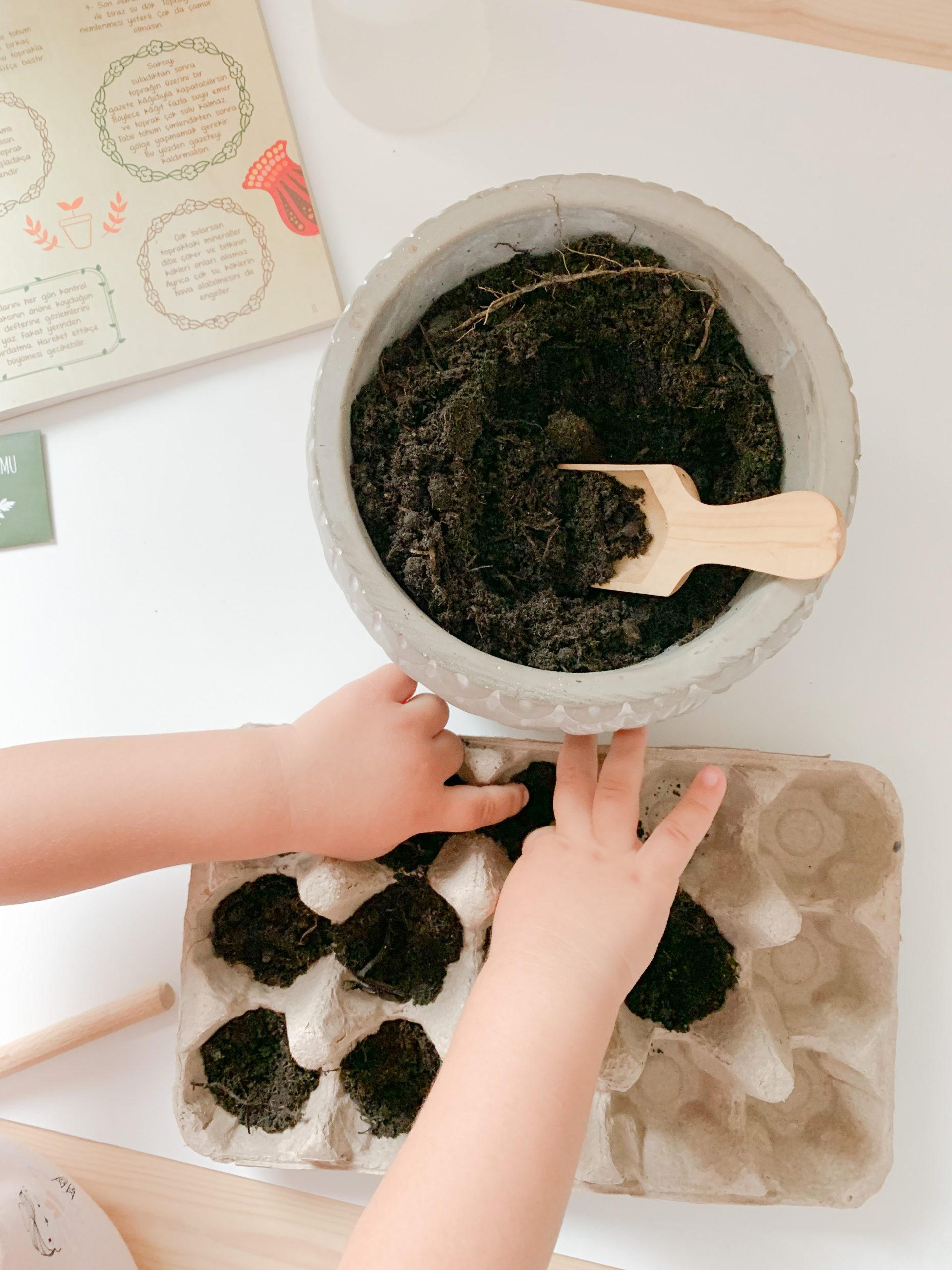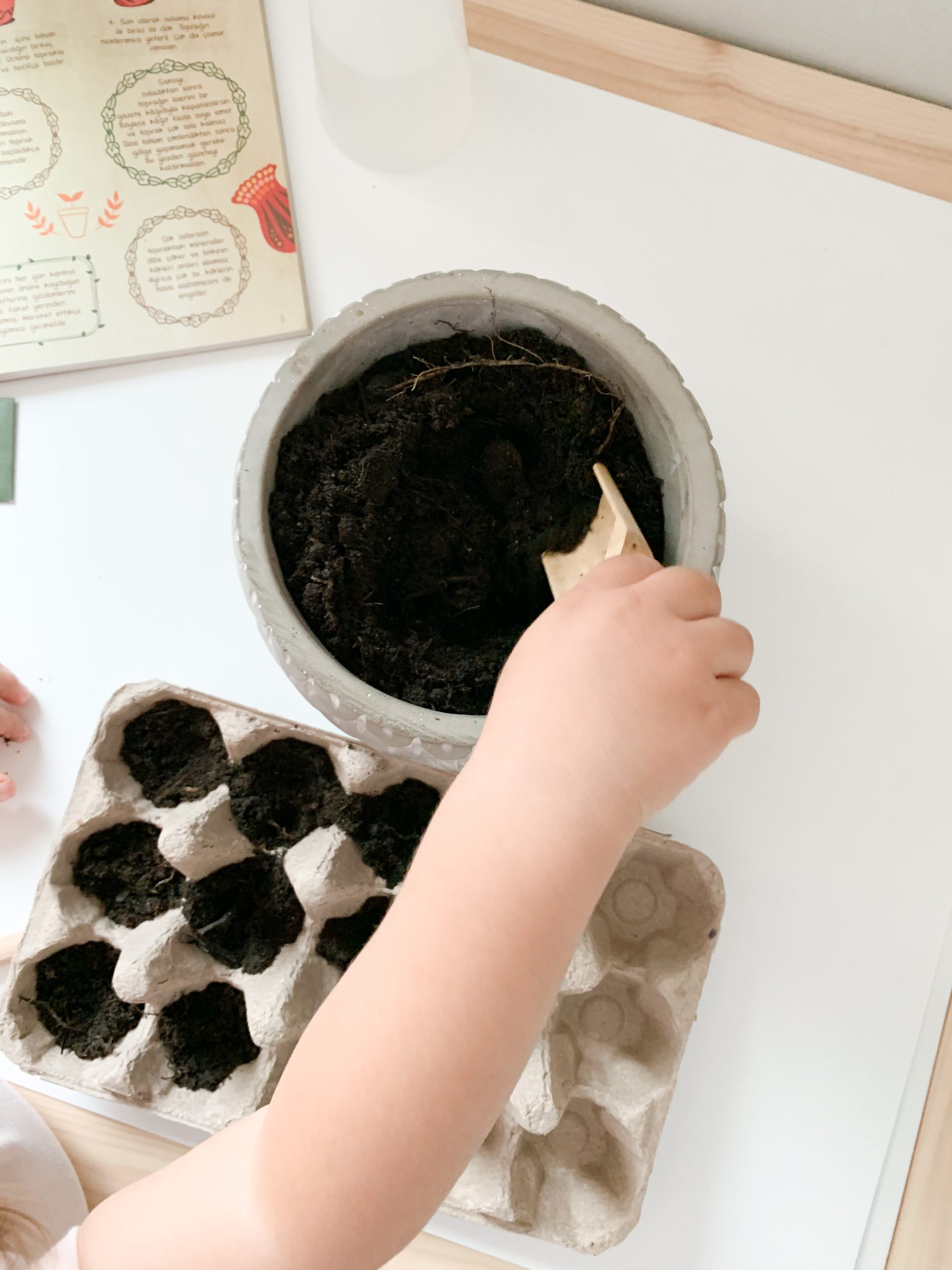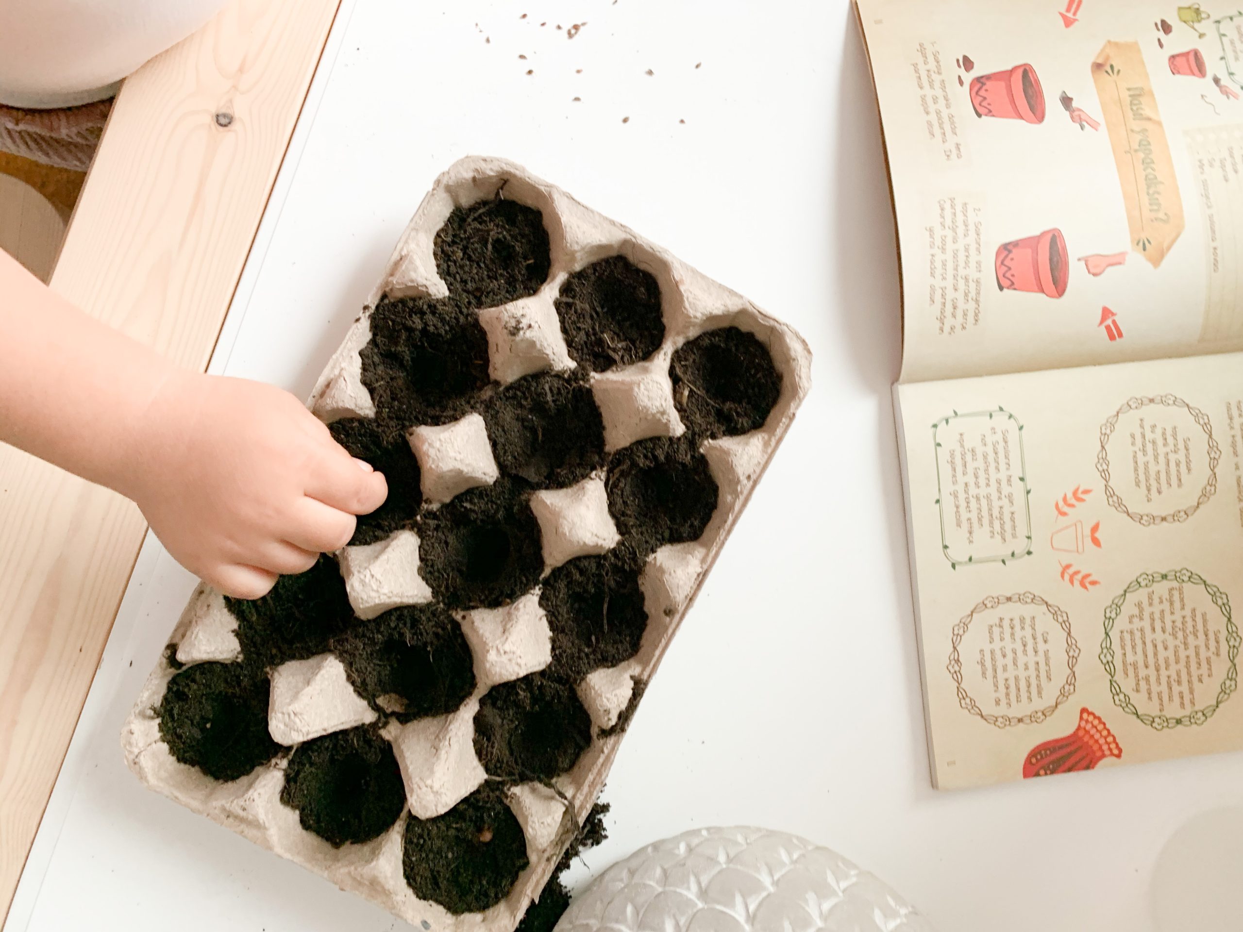 I had A scoop the soil into the egg carton cups, carefully place the seeds into the individual cups, cover them with more soil and then water it with a spray bottle. She loved watering the most I think . We planted parsley, peppers and basil.