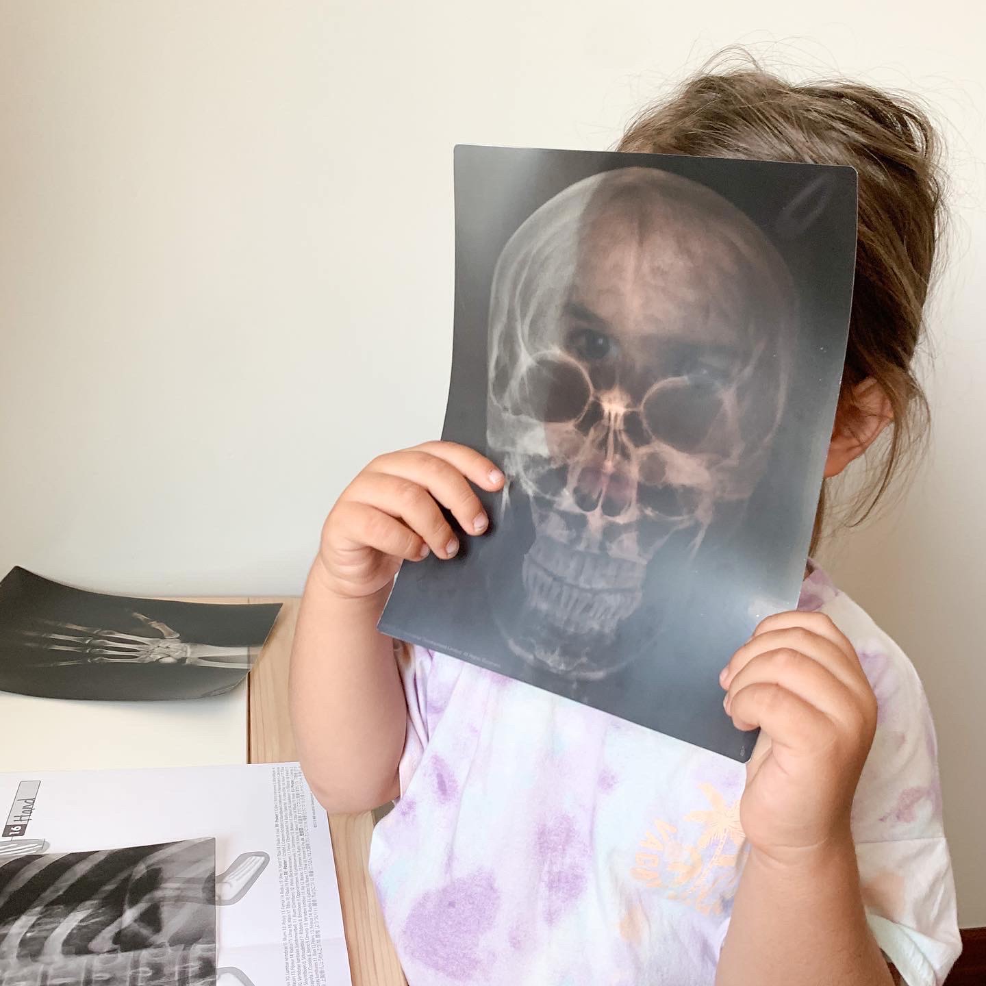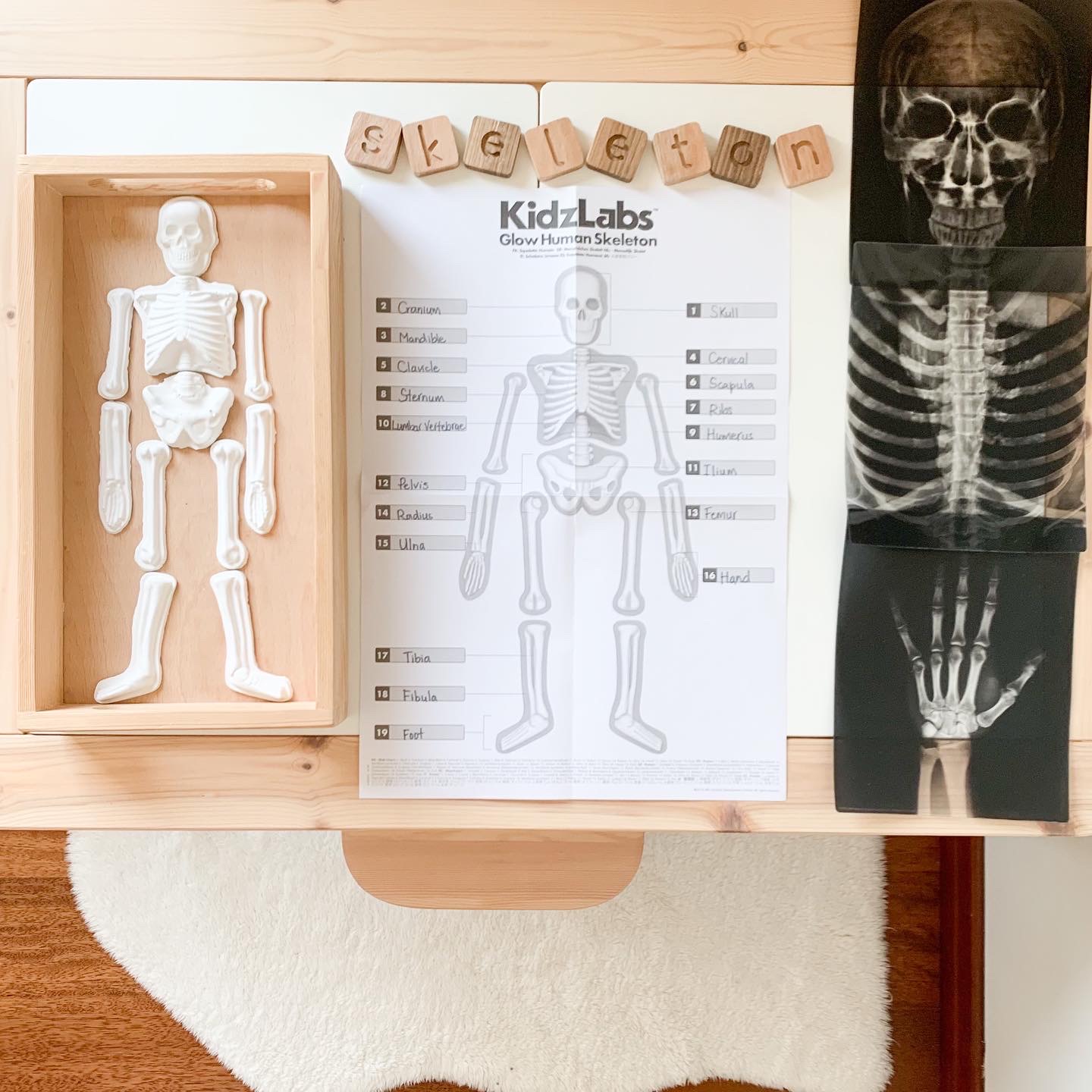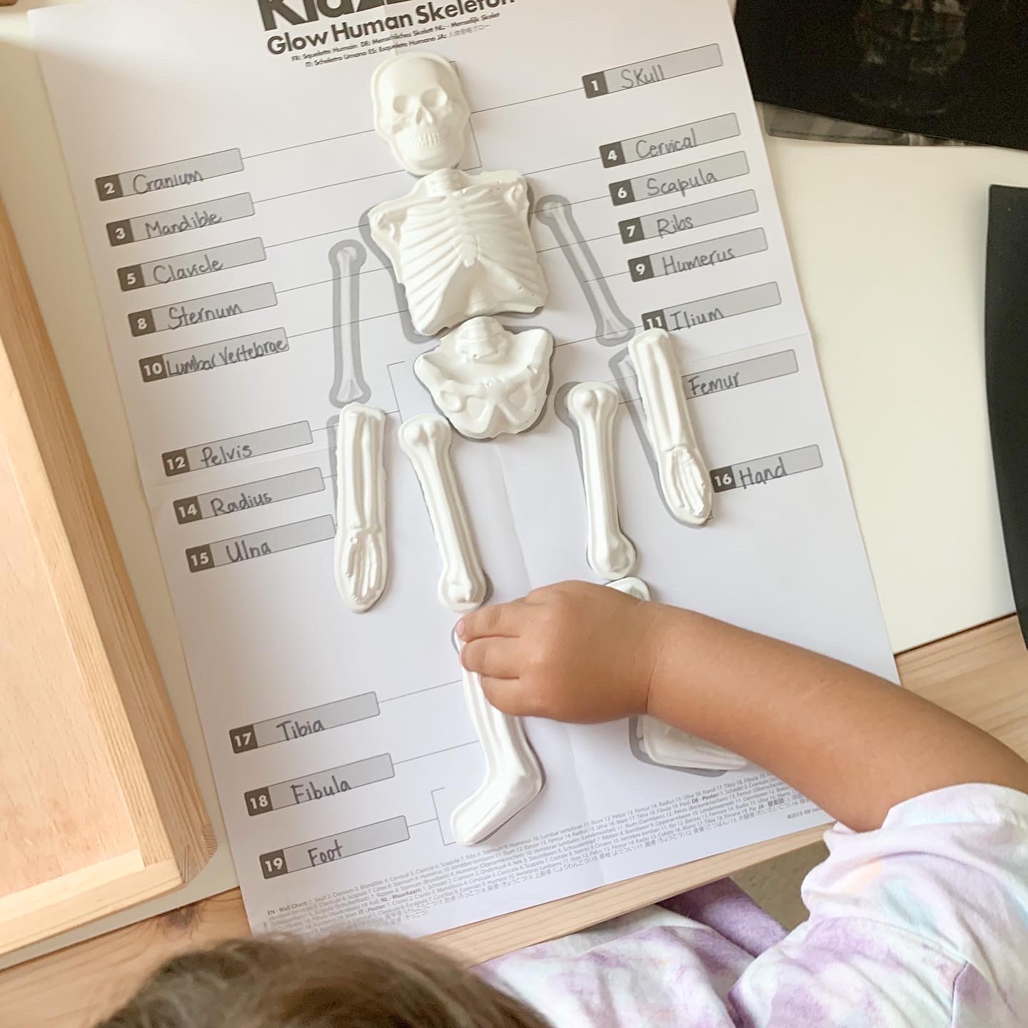 The bone chart in this activity was still a bit too advanced for A at this time so we just focused on the names of a few main bones. She had the chance to build the skeleton on the chart and was fascinated by the x-rays and the technology behind it, which we will now need to look into to answer some of her questions. 😀
