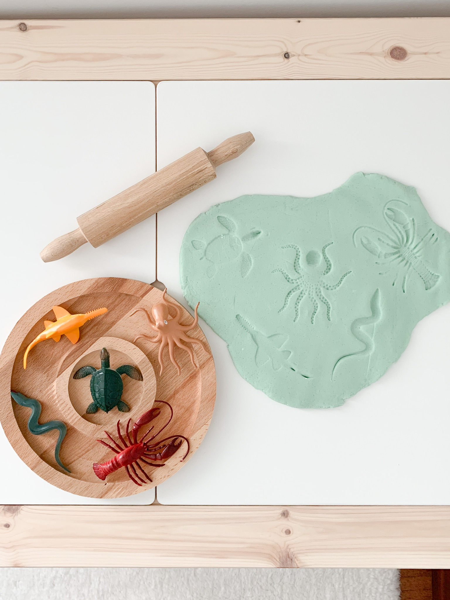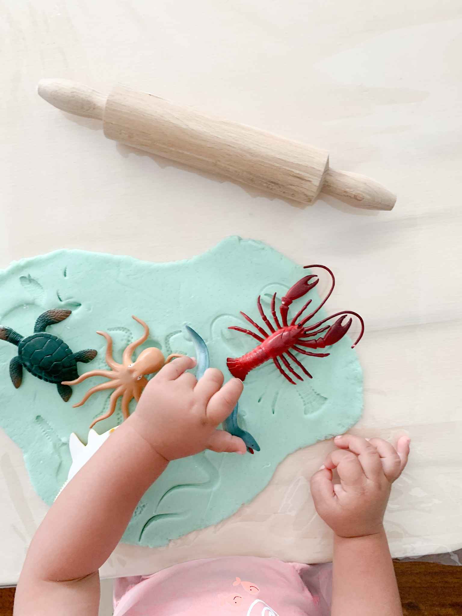 After my daughter solved the puzzle we made playdough balls, flattened them using her mini rolling pin and used the sea animals to make new shapes.
