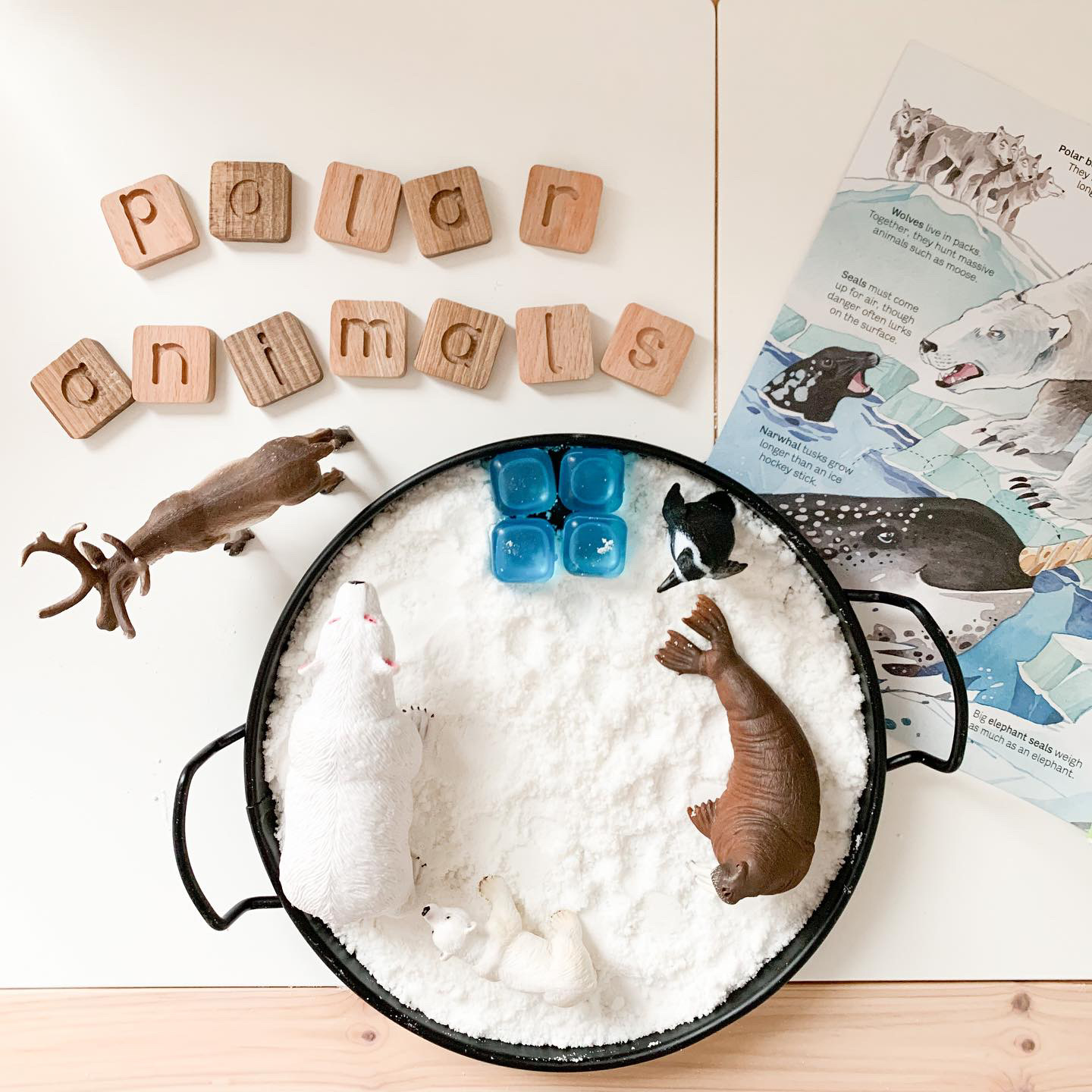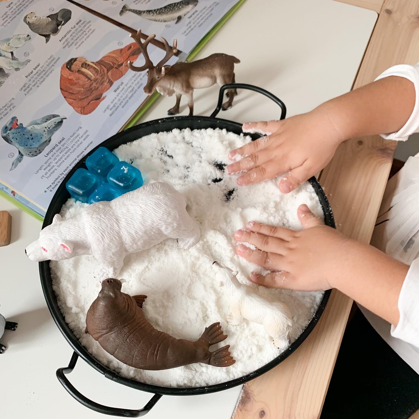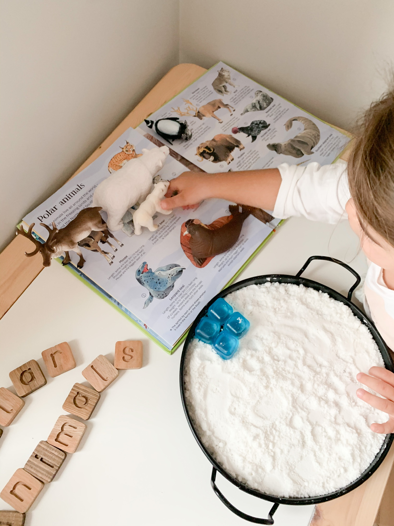 I used this super simple setup with sensory snow so we could explore and learn more about polar animals. When it comes to sensory play, the simplest of setups are always a hit with my daughter. She didn’t use any tools, she just wanted to feel the “snow” and play with the animal figurines.