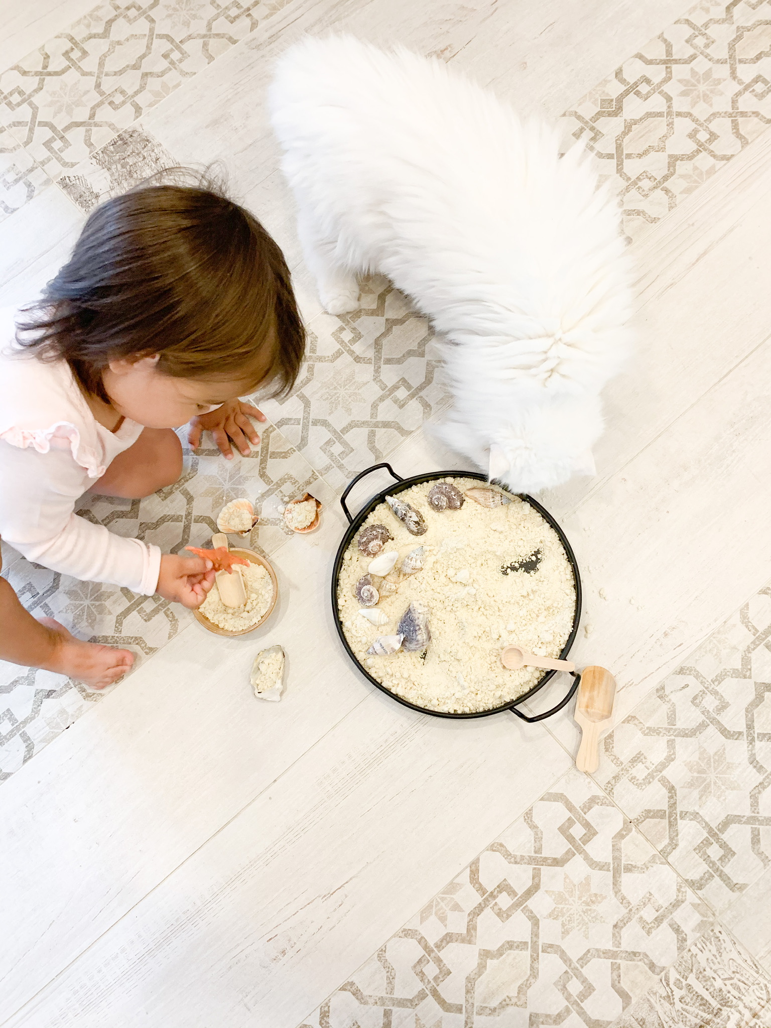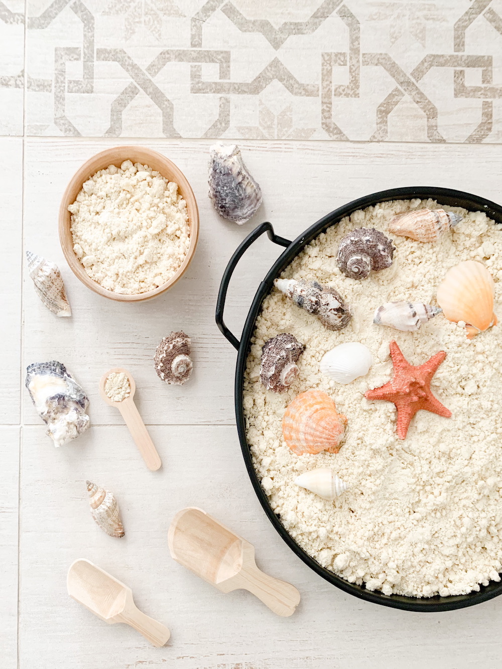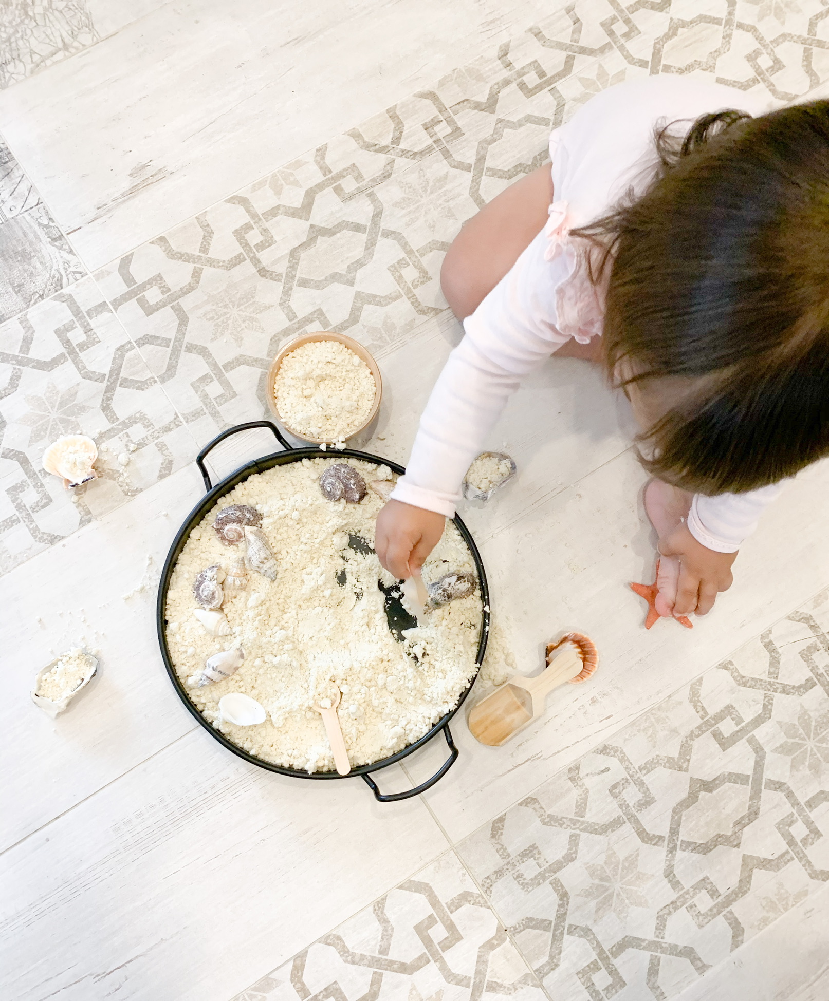 How about taking this sensory play outside (weather permits)? Or, even better, play and explore seashells at the beach?