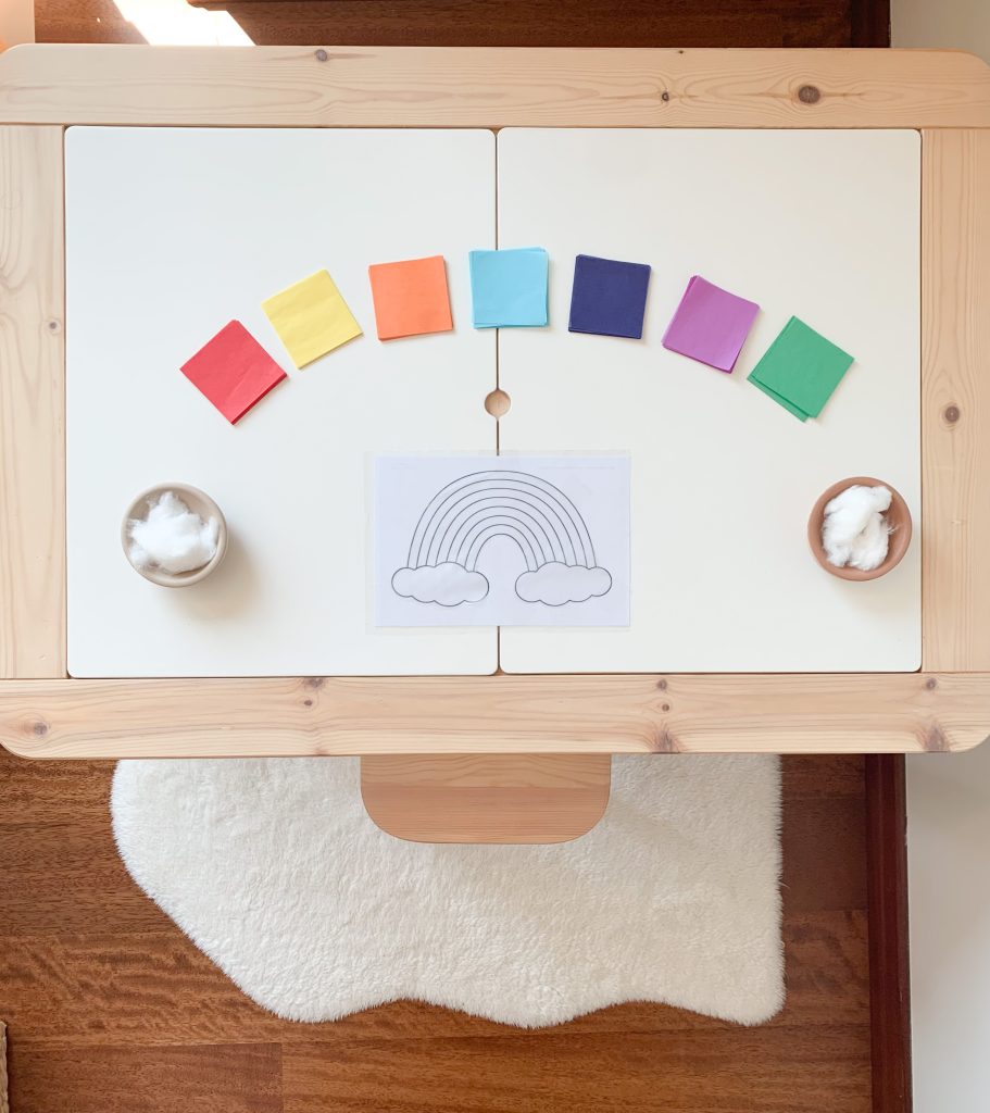 Tape the printout to the table so it doesn’t move when the child is working. Then use the double sided tape on top of the rainbow image.