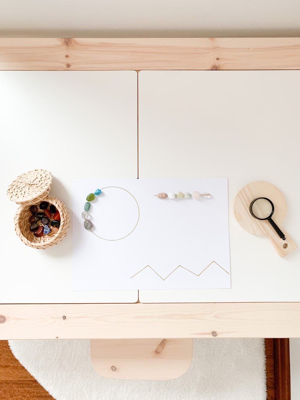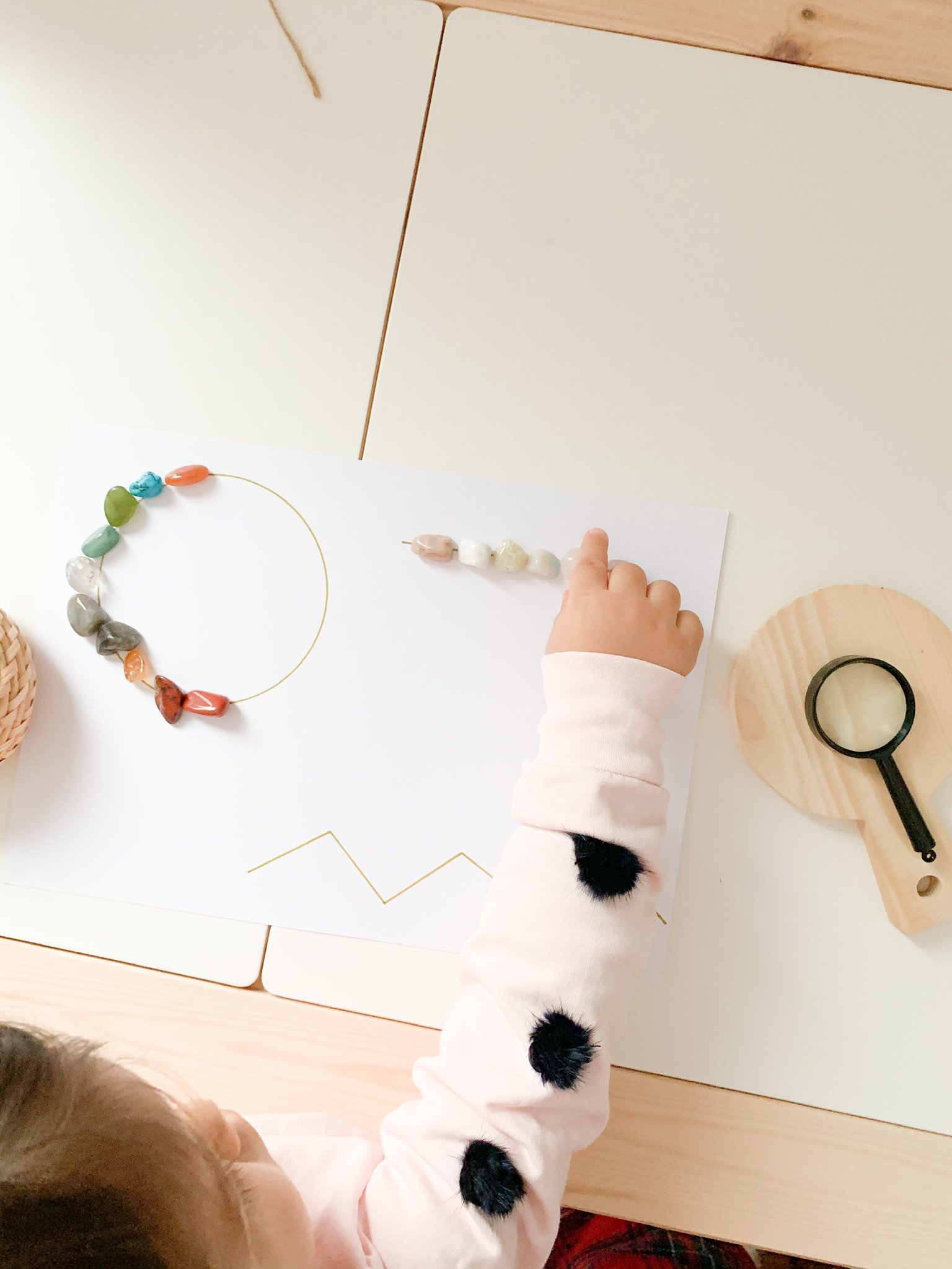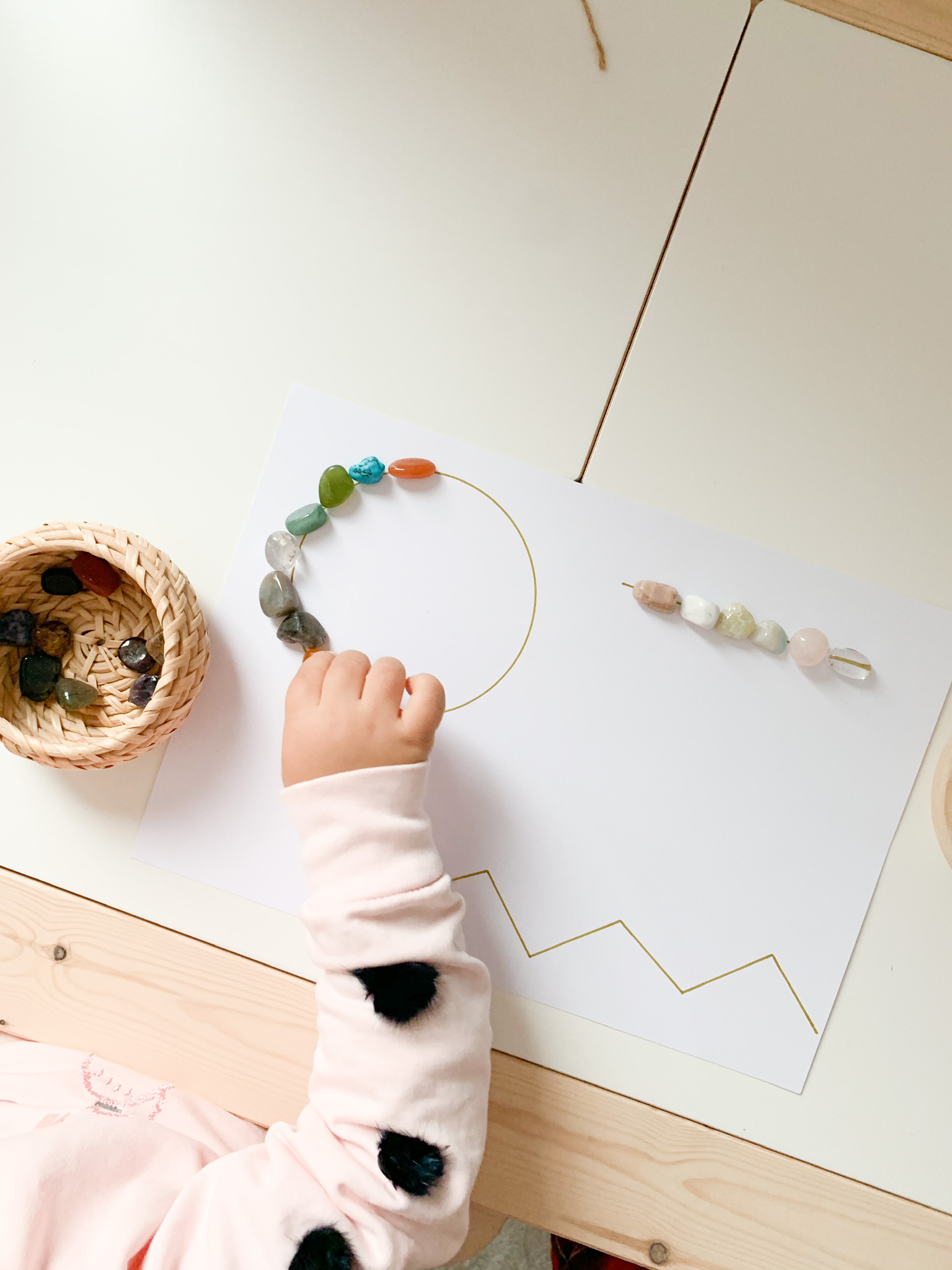 Draw a few shapes on the sheet of paper and provide the child with a small container with small stones or loose parts. Invite the child to trace the lines and shapes using the stones provided. Demonstrate by making one yourself.