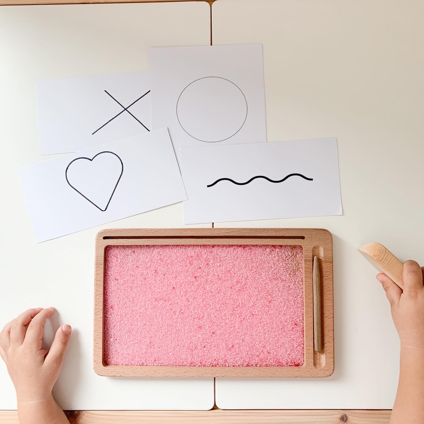 Sand trays are a key pre-writing resource in Montessori education, helping children to improve their eye-hand coordination and fine motor skills.