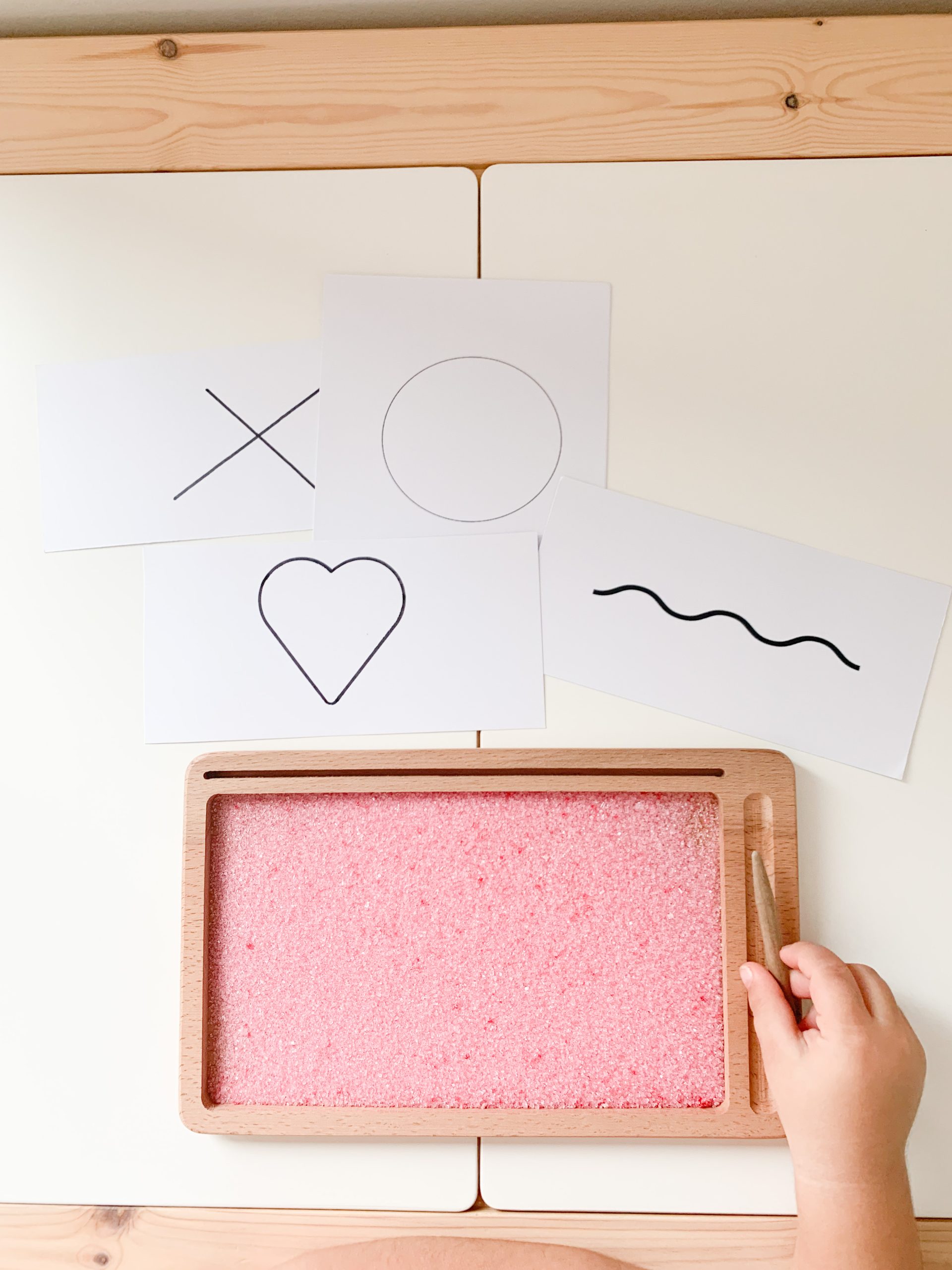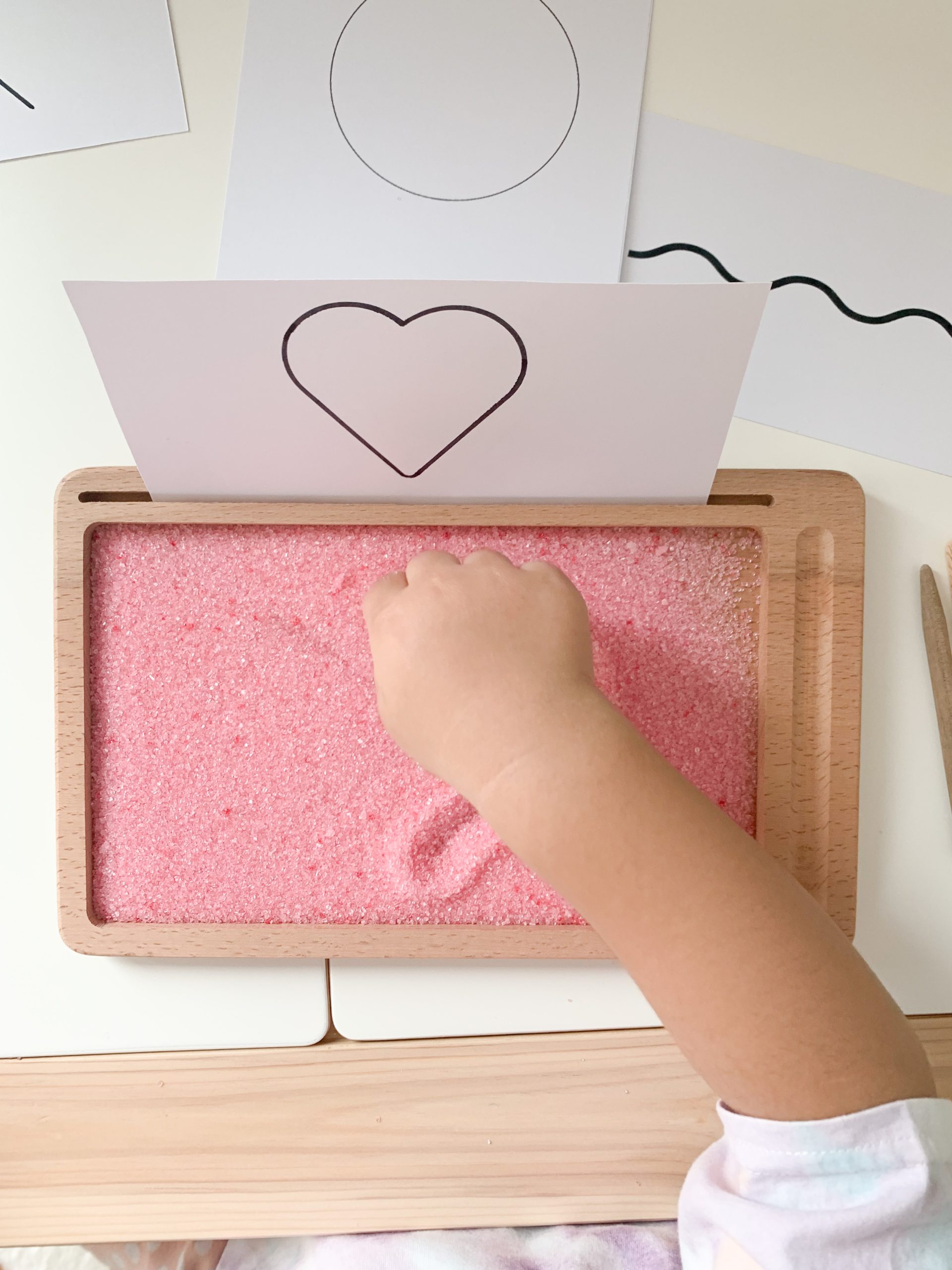 My daughter had been showing more of an interest in these types of activities so I thought it would be fun to practice some Valentine’s Day-inspired shapes. Writing on sand can be so calming and bring you right to the present moment.