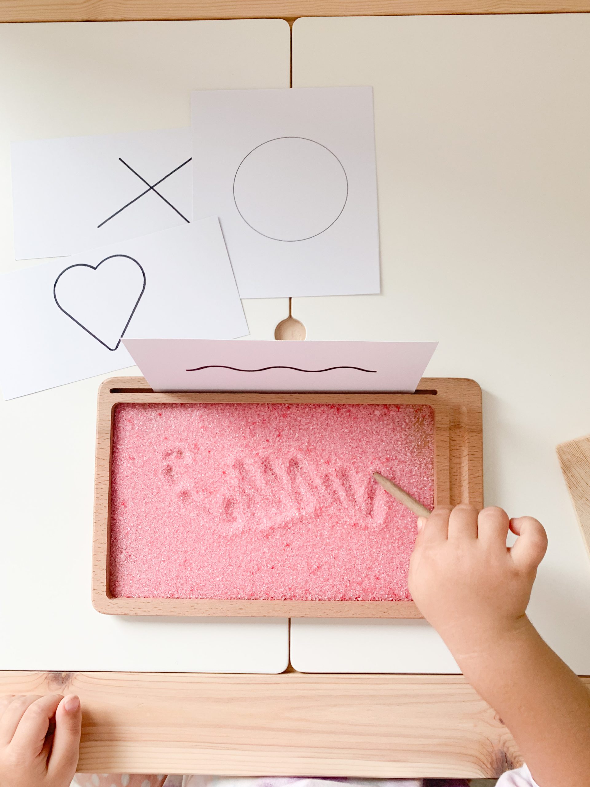 Here’s a simple activity I set up for my three-year old on Valentine’s Day: a little tracing practice with our sand tray.