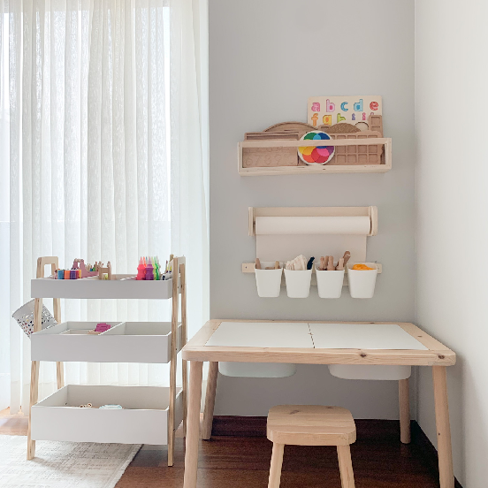 Make sure you have a functional space where everything has a designated place and your child knows where it goes. For example, art supplies go on the art caddy, books go on the bookshelf, activities go on the shelf. Keep it simple for both you and your child. Always model putting activities/ toys back when done using them and encourage your child to do the same.
